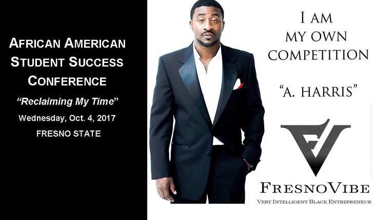 (October 3, 2017) — Adrian Harris, Fresno entrepreneur, will be the keynote speaker at the African American Student Success Conference, “Reclaiming My Time”, from 9 a.m. to 1:30 p.m., Wednesday, Oct. 4, in the Satellite Student Union at Fresno State. Registration is now full.