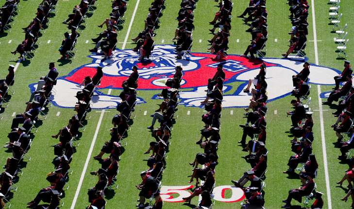 The first of six ceremonies was held Friday, May 14, for the Kremen School of Education and Human Development. Graduates seated on the football field were surrounded by family and friends who were socially distanced in the stands. The other ceremonies will be held at 7 p.m. Friday, Saturday and Sunday.