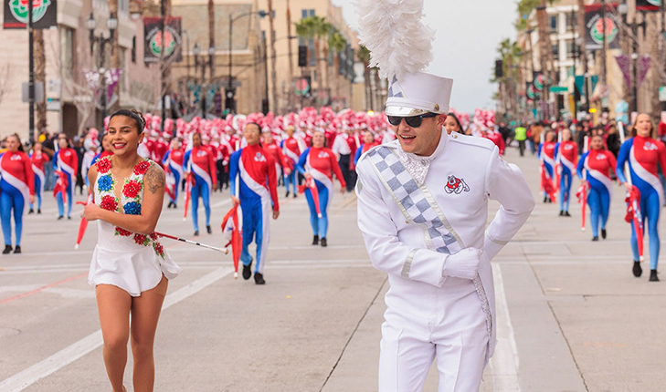 It was a cool, bright, 55-degree morning on Jan. 2, 2023, when the Fresno State Bulldog Marching Band began its march down Orange Grove Boulevard as the last entry in the Rose Parade. The theme was “Turning the Corner,” as this was the first Rose Parade to be held in person after the COVID-19 restrictions were lifted. But for the Bulldog Marching Band, “Turning the Corner” had a more immediate meaning – the 110-degree “broadcast” corner. The 270-piece band continued playing as it negotiated the turn onto Colorado Boulevard and into the main grandstand area.